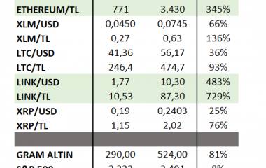 $BTCUSD $ETHUSD $LTCUSD $LINKUSD Kriptoparalar ve $USDTRY $EURTRY vb. yıllık performansları.