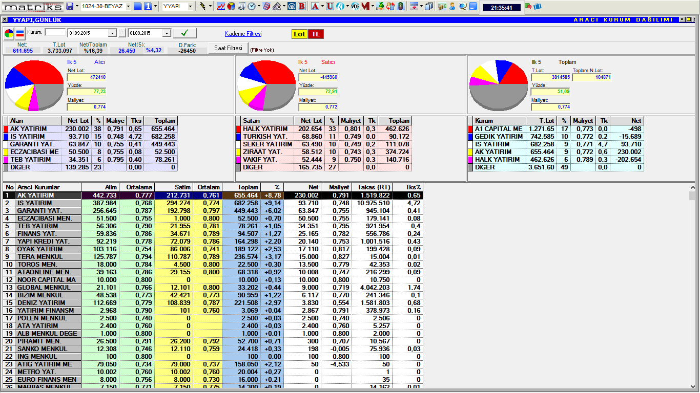 1 eylül 2015 tarihli salı günü takası , alım satım dağılımı , kim almış kim satmış